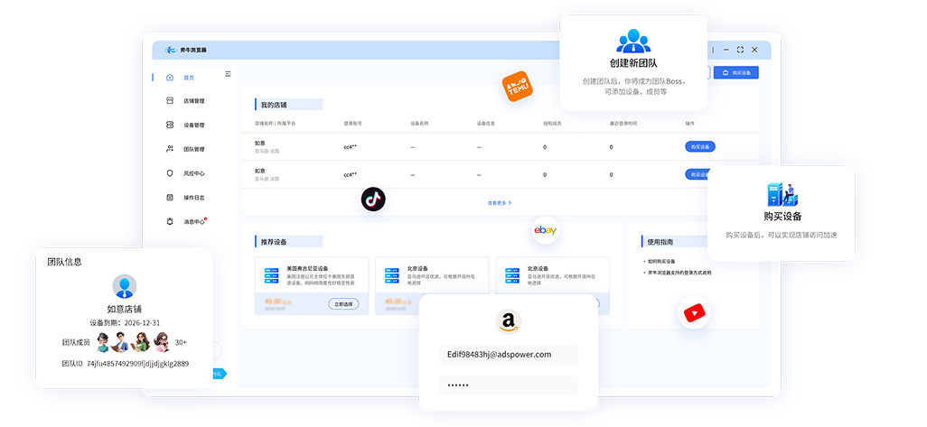 跨境电商卖家需同事管理亚马逊、eBay、Shopify等多平台账号,传统浏览器易因IP、设备指纹重复导致账号封禁。